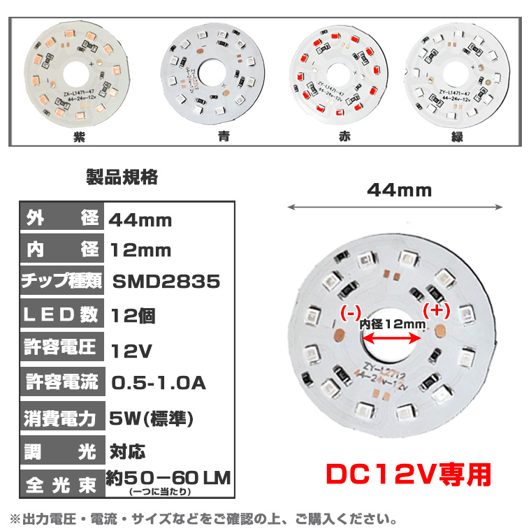 LEDモジュール LEDチップ LEDユニット DC12V 専用 12灯 5W SMD2835 丸型 44mm 紫/青/赤/緑 4色選択 調光対応 LEDランプ 照明 修理 交換用 DIY