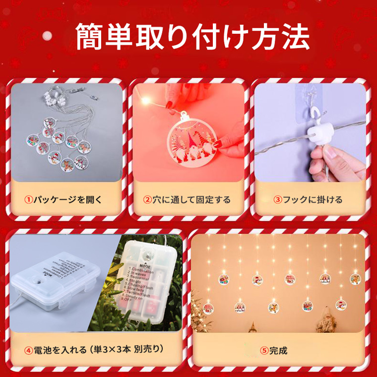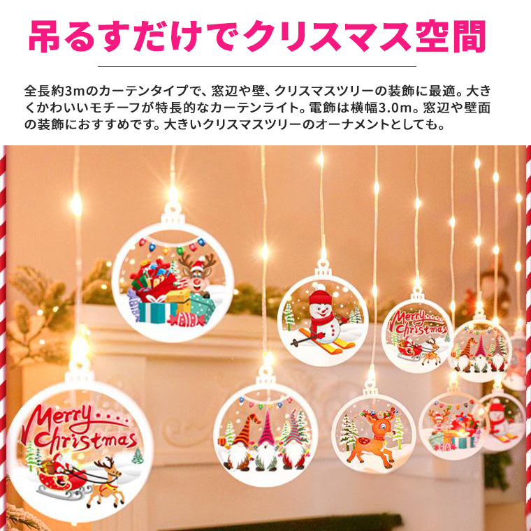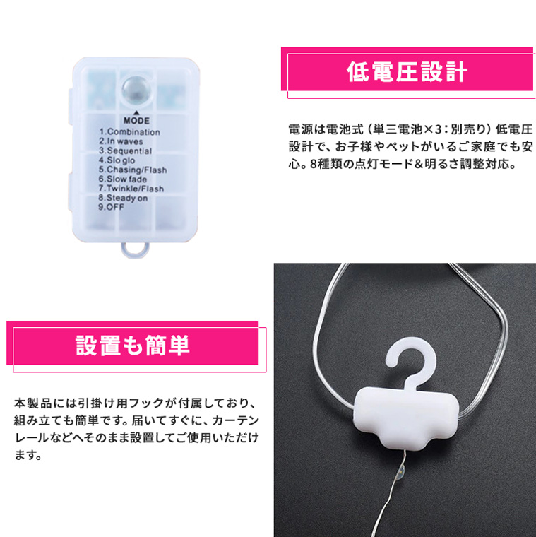 全長約3mのカーテンタイプで、窓辺や壁、クリスマスツリーの装飾に最適。8種類の点灯モード、明るさ調整、タイマー機能を搭載し、付属リモコンまたは本体ボタンで簡単操作が可能です。