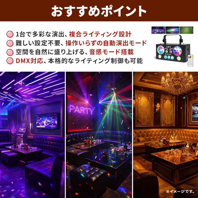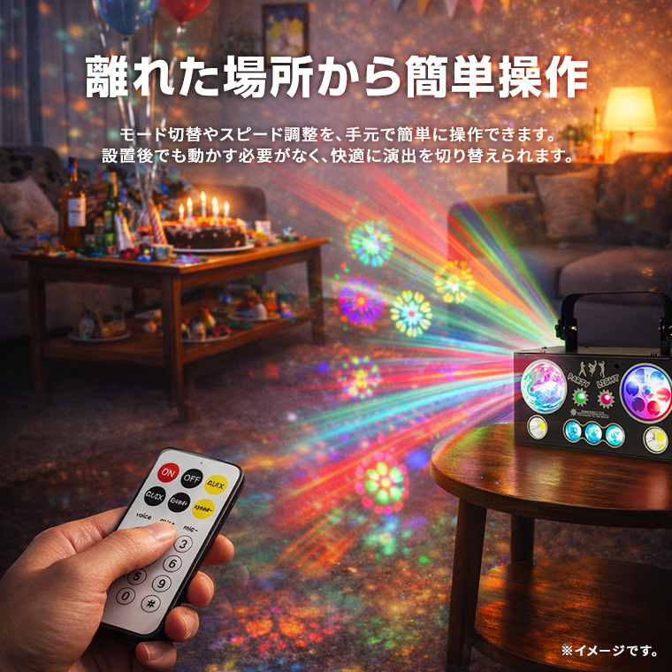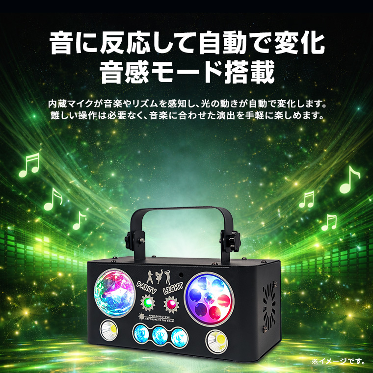 エフェクトライト マジックボール DMX対応 複合ライティング 音感対応 自動演出 リモコン付き スピード調整 レーザー 赤 緑 コンセント式 室内用 ステージライト ストロボ パーティーライト イベント 照明 LED 舞台照明 クラブ照明 電光ホーム