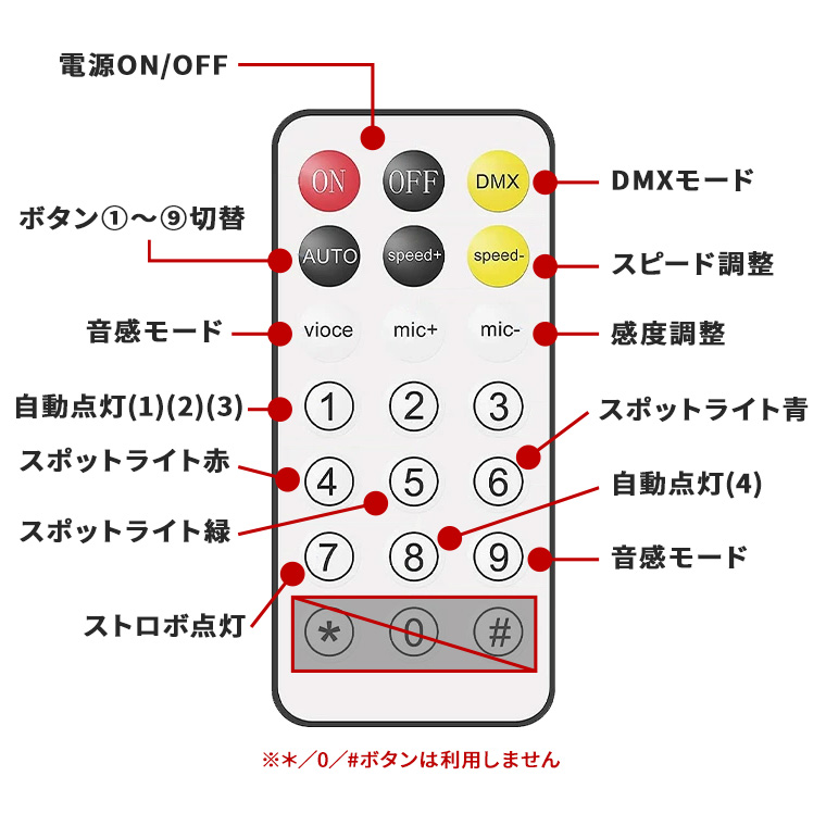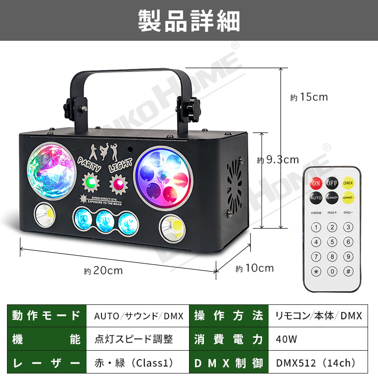 | 機能 | 自動点灯、DMXモード、サウンドモード、ストロボ、スポットライト、点灯スピード調整 |