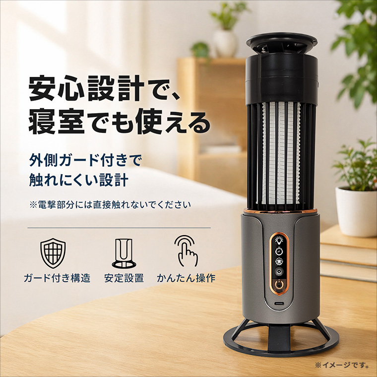 - 安心して使える設計。外側ガード付きで、電撃部分に直接触れにくい構造。さらに安定感のある設置設計で、倒れにくく安心して使用できます。寝室や室内でも使いやすいよう、安全性にも配慮されています。