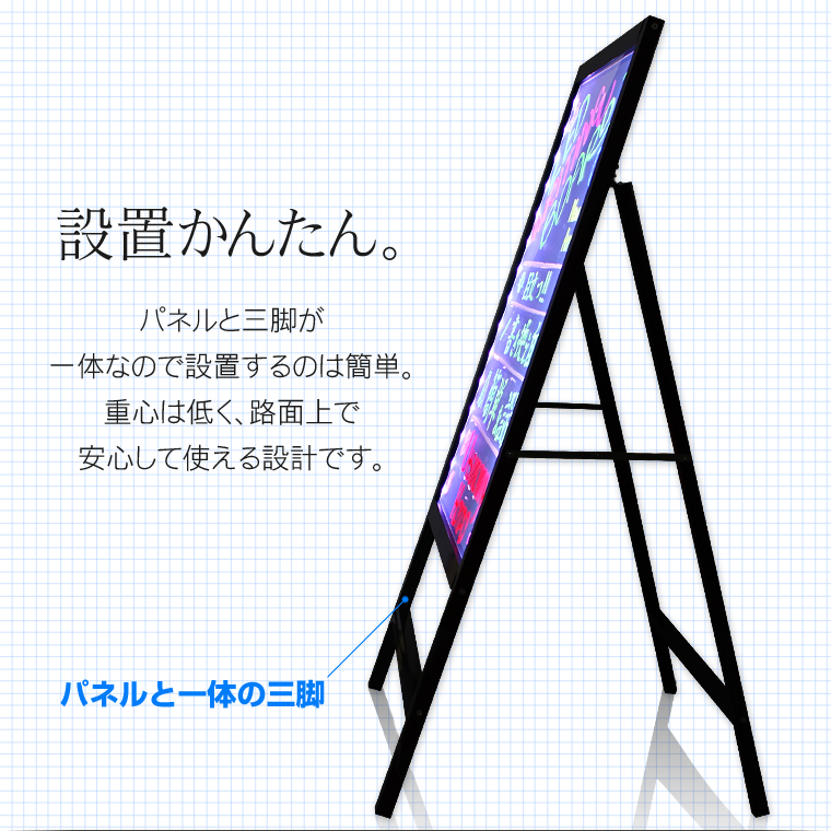 光る看板A型は三脚が不要、パネルは強化ガラスを採用。