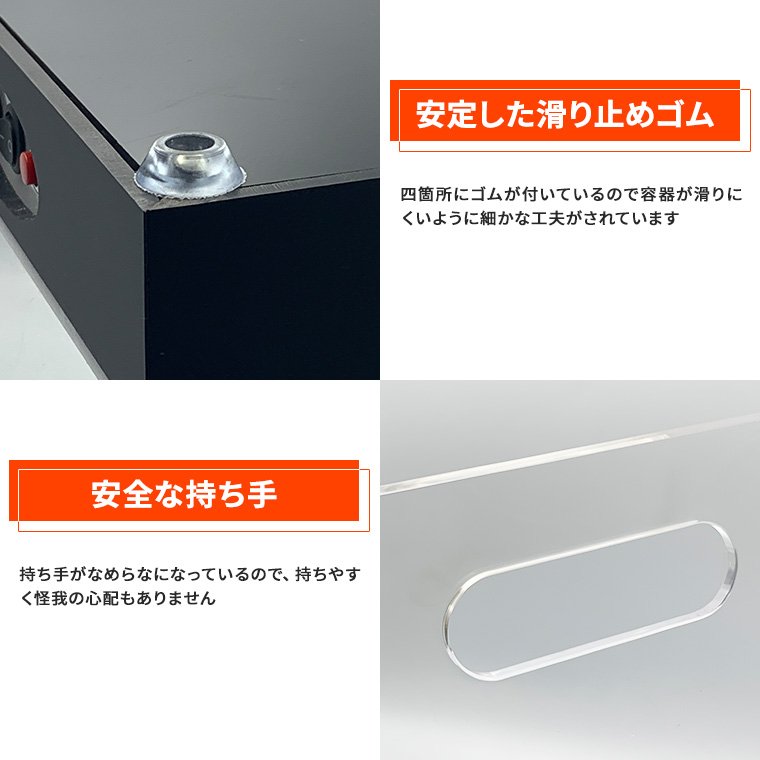 | 注意 | アルコールで拭くとヒビが入ったり白く汚れてしまいますのでアルコールでの容器を吹かないでください |