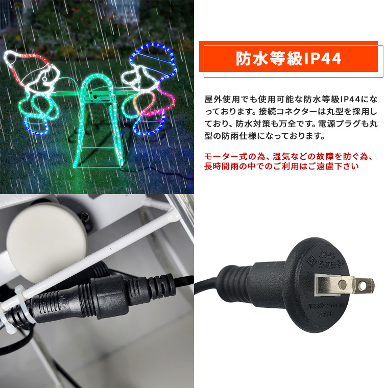 - 防水等級IP44。屋外使用でも使用可能な防水等級IP44になっております。接続コネクターは丸型を採用しており、防水対策も万全です。電源プラグも丸型の防雨仕様になっております。モーター式の為、湿気などの故障を防ぐ為、長時間雨の中でのご利用はご遠慮下さい