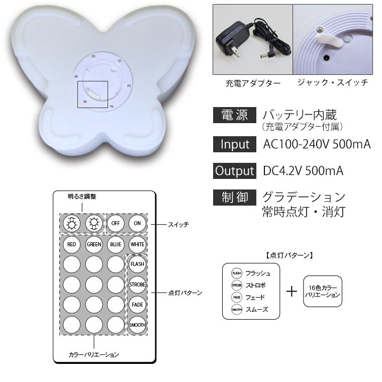| 点灯パターン | フラッシュ・ストロボ・フェード・スムーズ |