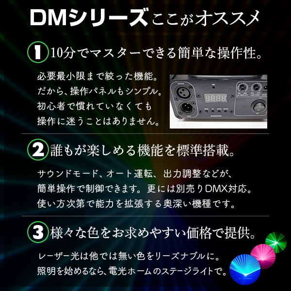 | 制御 | 自動、サウンドアクティブモード(音に反応)、DMX512(8チャンネル)モード、スレーブモード |