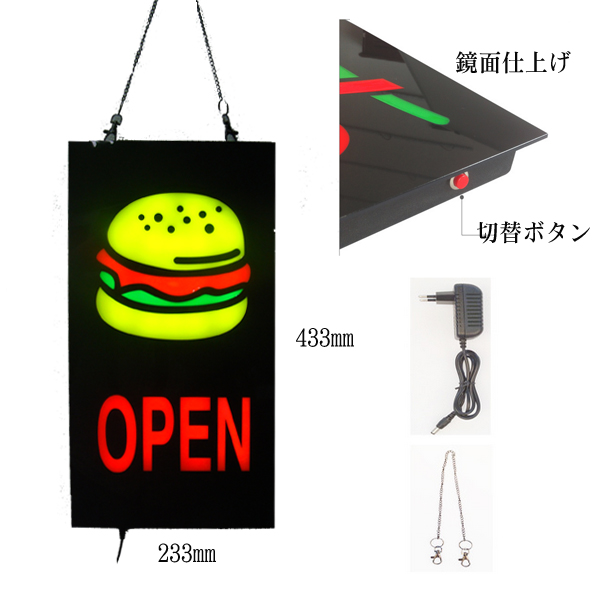 光る看板 樹脂流し込みモデル 「OPEN」 ハンバーガーイラスト入り 高さ43.3cm×幅23.3cm
